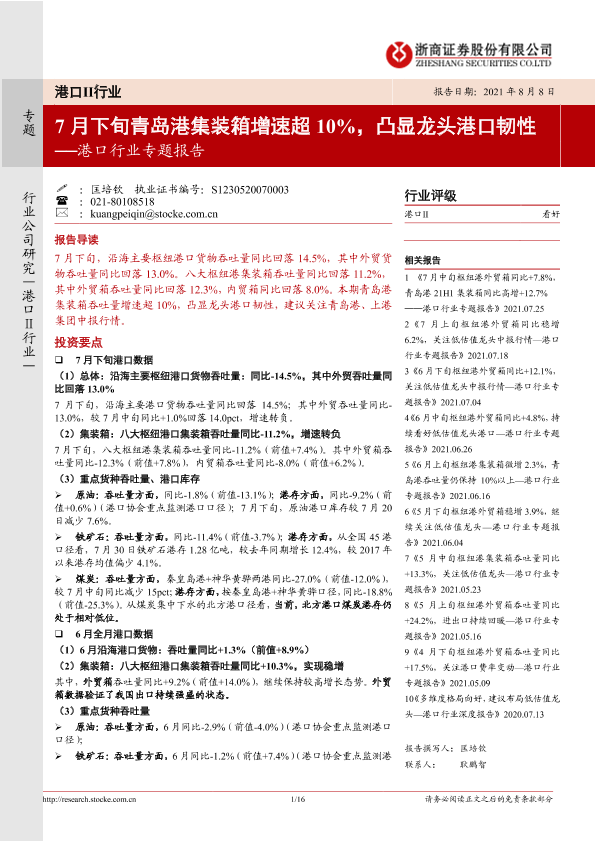 【浙商证券】【20210808】7月下旬青岛港集装箱增速超10%,凸显龙头港口韧性-16页