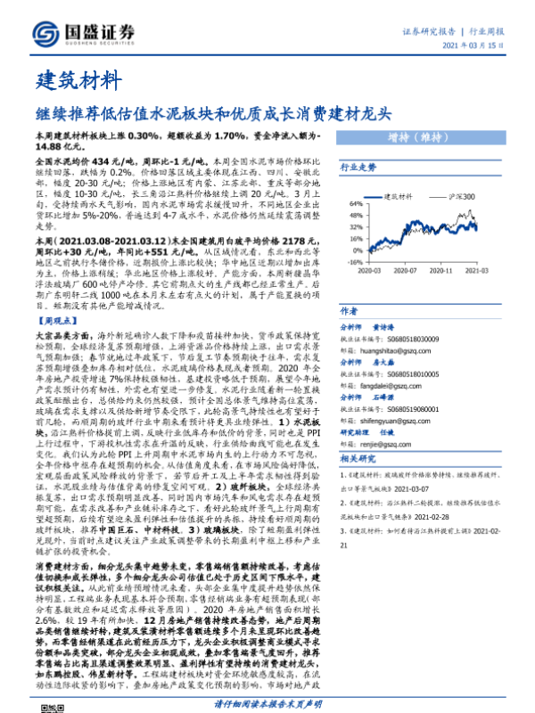 【国盛证券】【20210315】建筑材料行业周报:继续推荐低估值水泥板块和优质成长消费建材龙头-23页