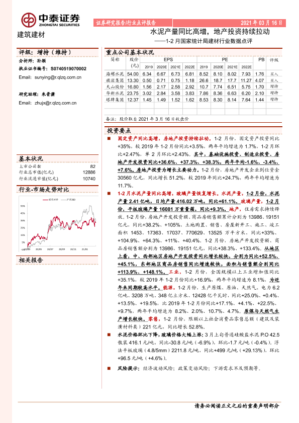 【中泰证券】【20210316】建筑建材-1-2月国家统计局建材行业数据点评:水泥产量同比高增,地产投资持续拉动-8页