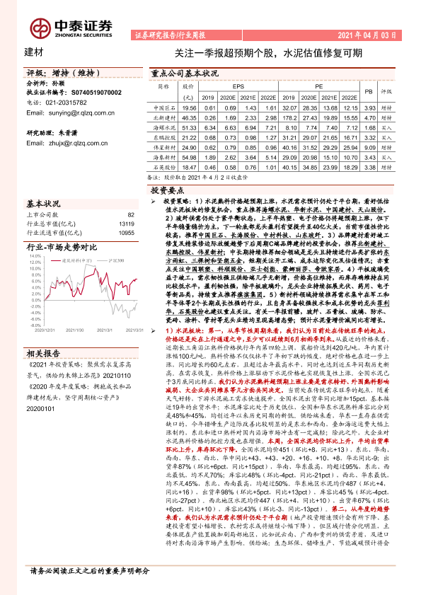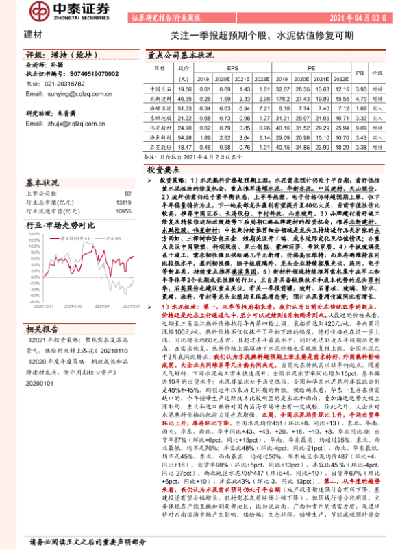 【中泰证券】【20210403】建材行业周报:关注一季报超预期个股,水泥估值修复可期-27页
