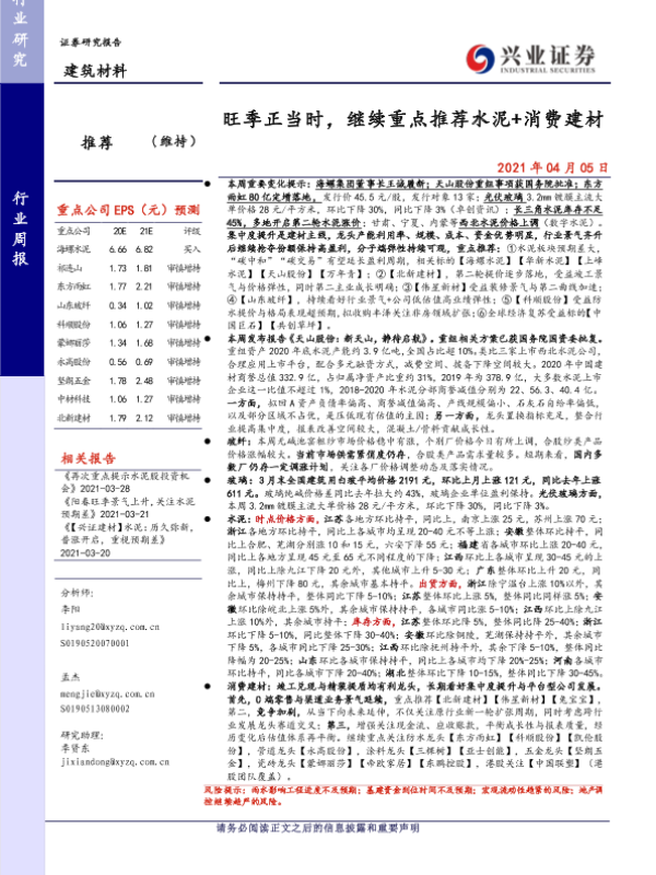 【兴业证券】【20210405】建筑材料行业周报:旺季正当时,继续重点推荐水泥+消费建材-21页