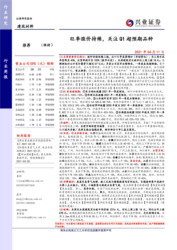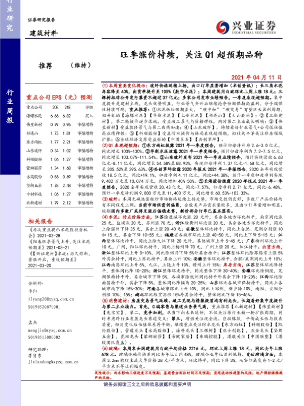 【兴业证券】【20210411】建筑材料行业周报:旺季涨价持续,关注Q1超预期品种-21页
