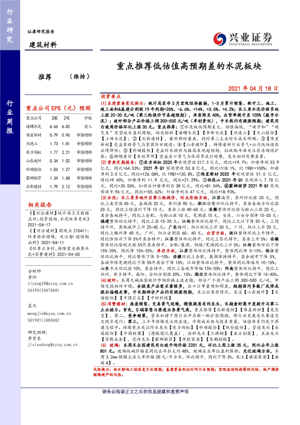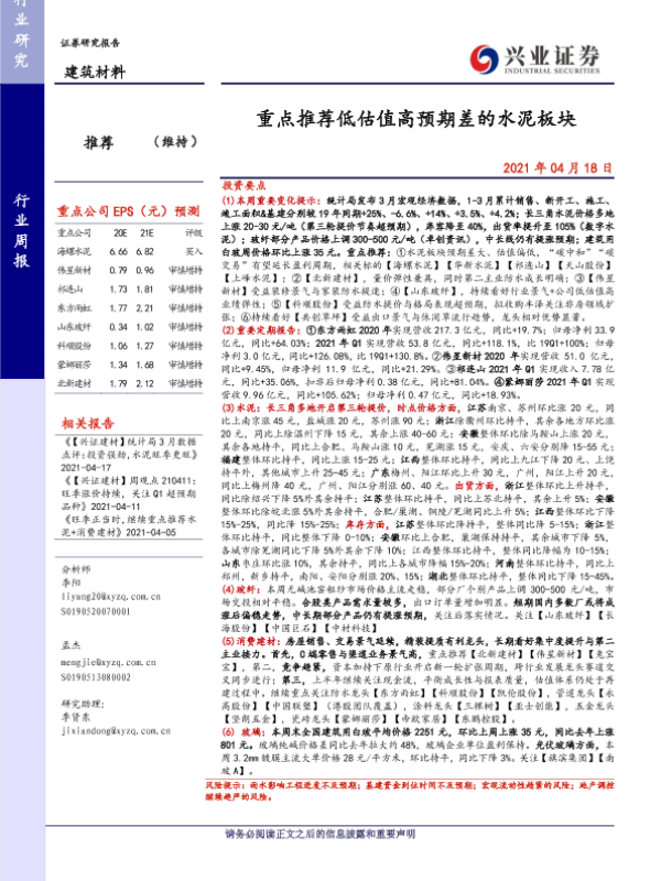 【兴业证券】【20210418】建筑材料行业:重点推荐低估值高预期差的水泥板块-20页