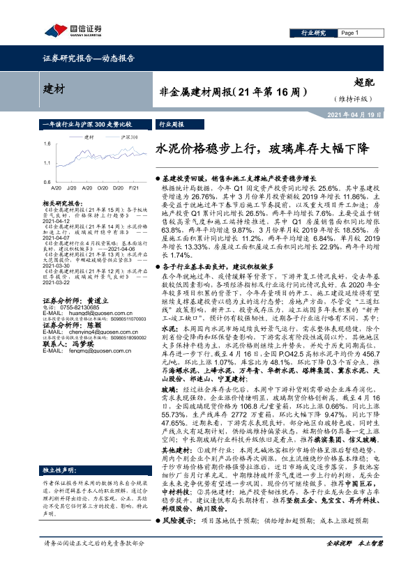 【国信证券】【20210419】非金属建材周报:水泥价格稳步上行,玻璃库存大幅下降-18页