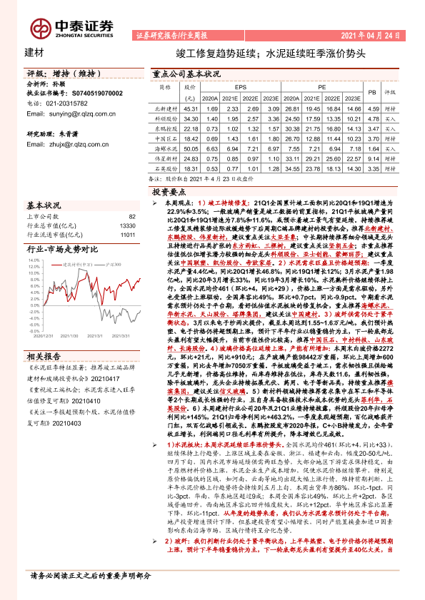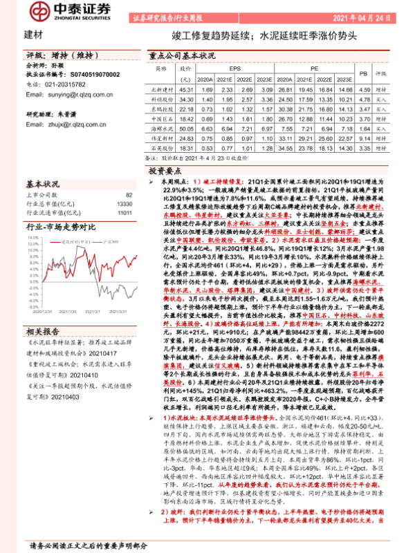 【中泰证券】【20210424】建材行业周报:竣工修复趋势延续;水泥延续旺季涨价势头-26页