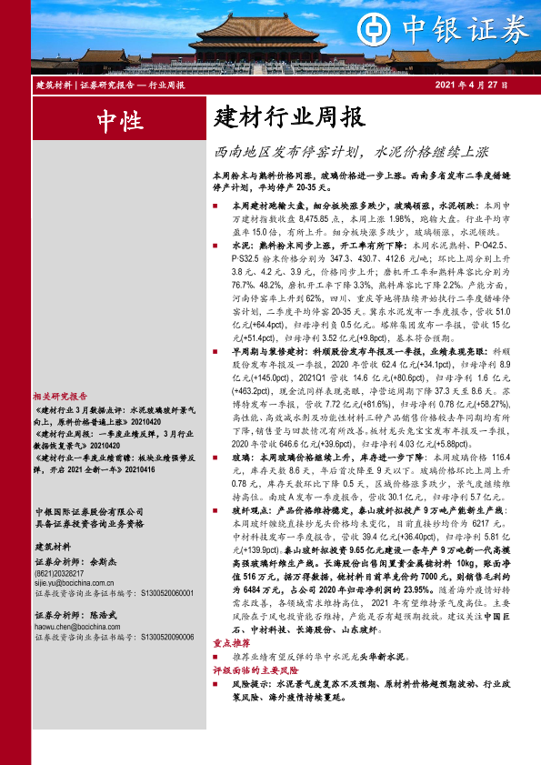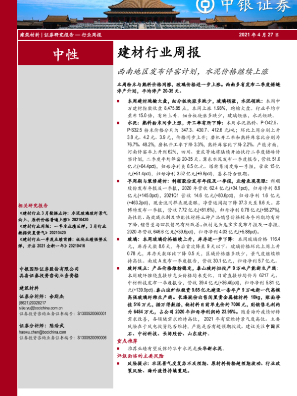 【中银证券】【20210427】建材行业周报:西南地区发布停窑计划,水泥价格继续上涨-15页