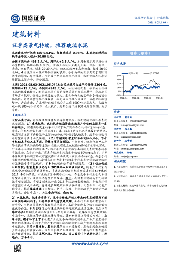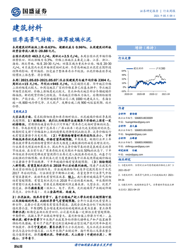 【国盛证券】【20210509】建筑材料行业周报:旺季高景气持续,推荐玻璃水泥-27页