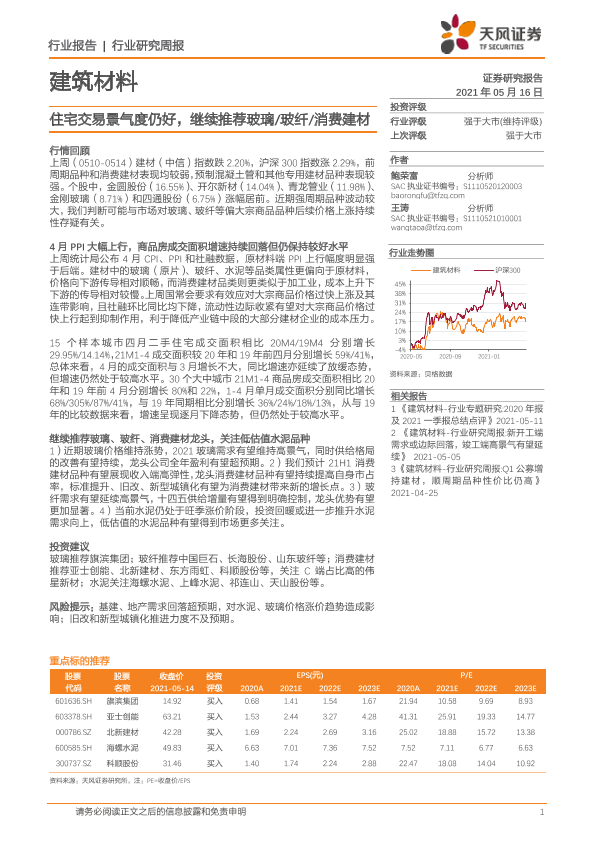 【天风证券】【20210516】建筑材料行业研究周报:住宅交易景气度仍好,继续推荐玻璃 玻纤 消费建材-7页