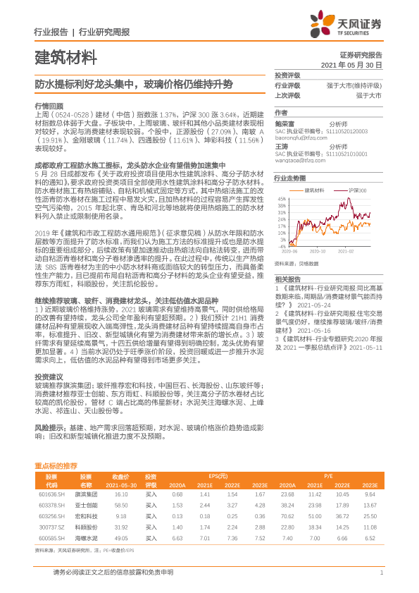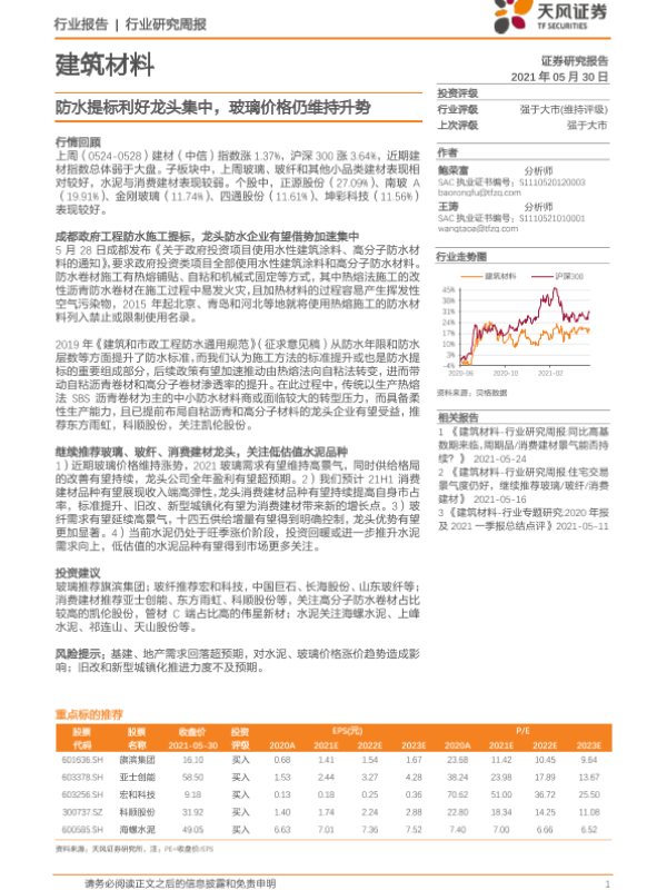 【天风证券】【20210530】建筑材料行业研究周报:防水提标利好龙头集中,玻璃价格仍维持升势-5页