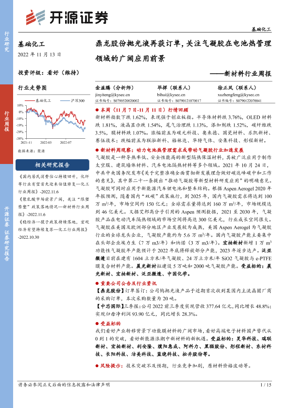 【开源证券】【20221113】新材料行业周报:鼎龙股份抛光液再获订单,关注气凝胶在电池热管理领域的广阔应用前景-15页