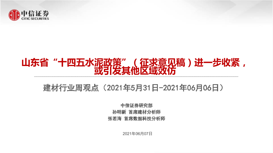 【中信证券】【20210607】建材行业周观点:山东省“十四五水泥政策”进一步收紧,或引发其他区域效仿-52页