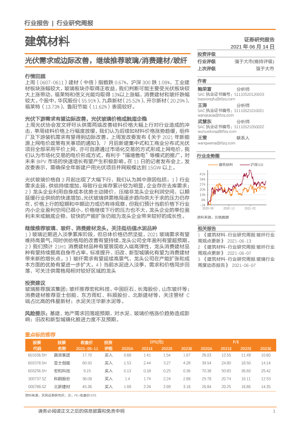 【天风证券】【20210614】建筑材料行业研究周报:光伏需求或边际改善,继续推荐玻璃 消费建材 玻纤-6页