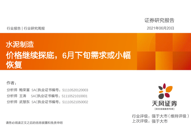 【天风证券】【20210620】水泥制造行业研究周报:价格继续探底,6月下旬需求或小幅恢复-19页