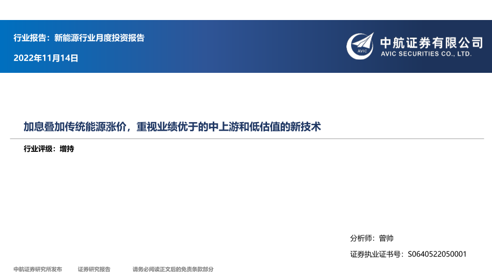 【中航证券】【20221114】新能源行业月度投资报告:加息叠加传统能源涨价,重视业绩优于的中上游和低估值的新技术-18页