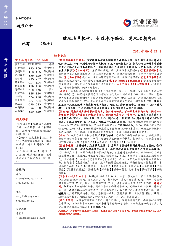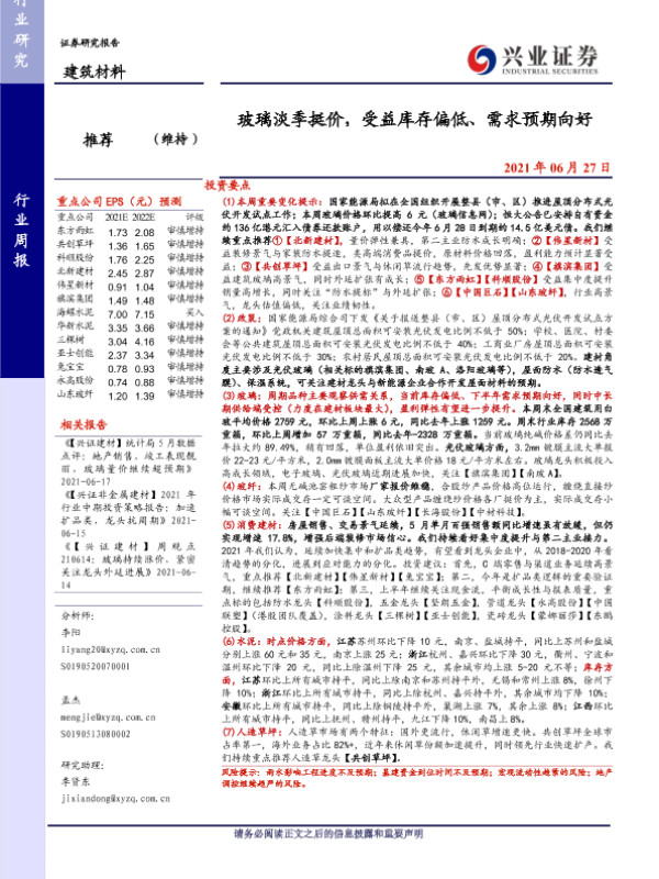 【兴业证券】【20210627】玻璃淡季挺价,受益库存偏低、需求预期向好-21页