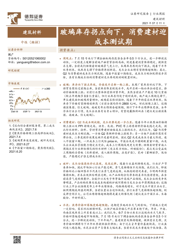 【德邦证券】【20210711】建筑材料行业周报:玻璃库存拐点向下,消费建材迎成本测试期-18页