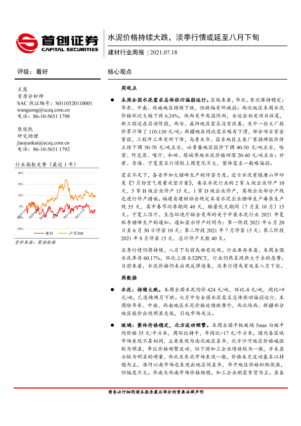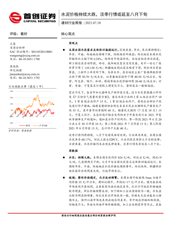【首创证券】【20210718】建材行业周报:水泥价格持续大跌,淡季行情或延至八月下旬-38页