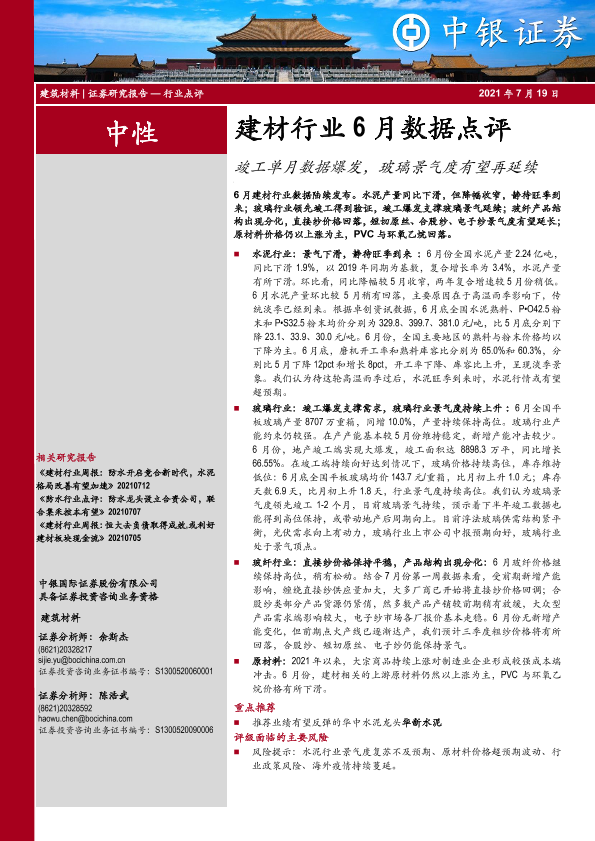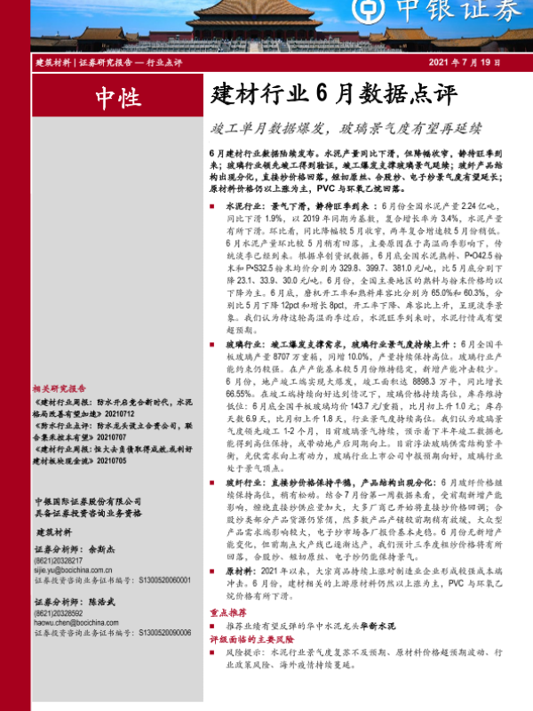 【中银证券】【20210719】建材行业6月数据点评:竣工单月数据爆发,玻璃景气度有望再延续-8页