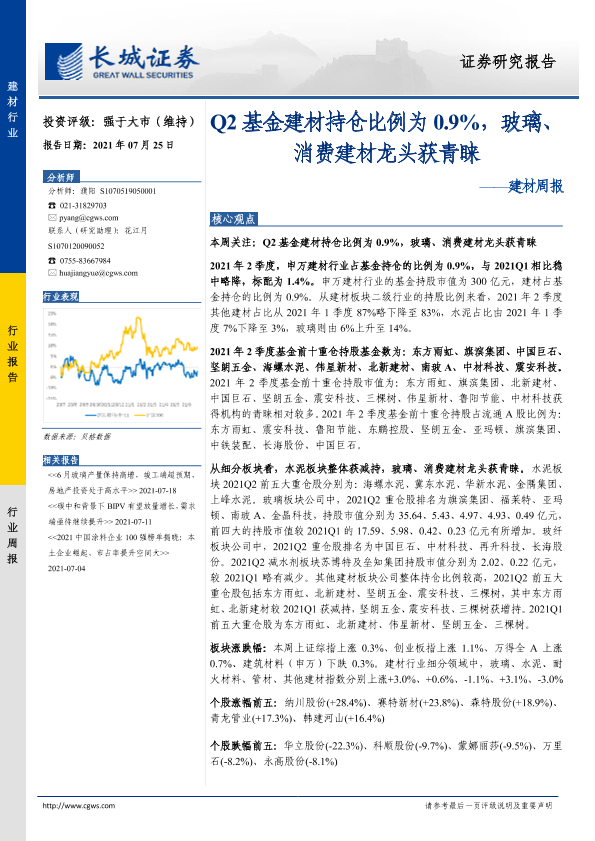 【长城证券】【20210725】Q2基金建材持仓比例为0.9%,玻璃、消费建材龙头获青睐-23页
