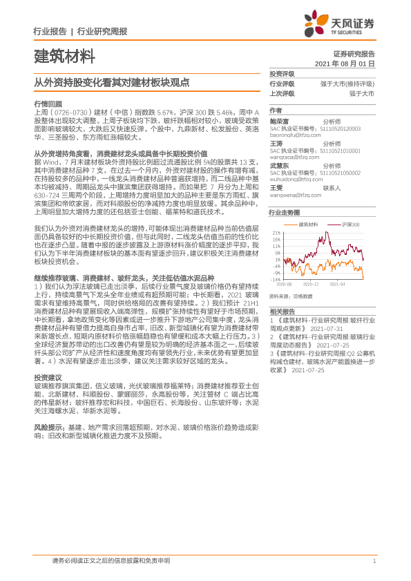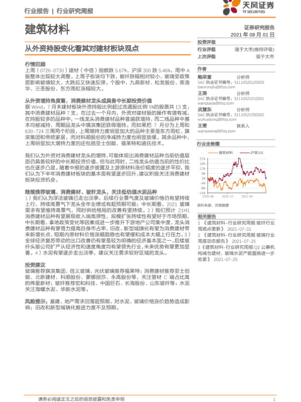 【天风证券】【20210801】建筑材料行业研究周报:从外资持股变化看其对建材板块观点-6页
