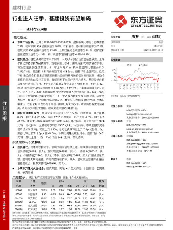 【东方证券】【20210807】建材行业周报:行业进入旺季,基建投资有望加码-22页