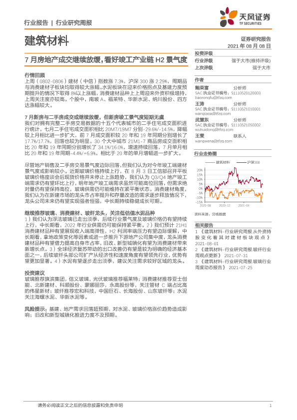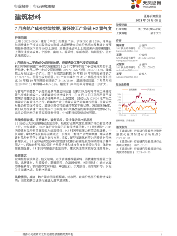 【天风证券】【20210808】建筑材料行业研究周报:7月房地产成交继续放缓,看好竣工产业链H2景气度-6页