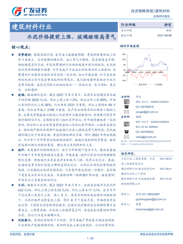 【广发证券】【20210808】建筑材料行业投资策略周报:水泥价格提前上涨,玻璃继续高景气-20页