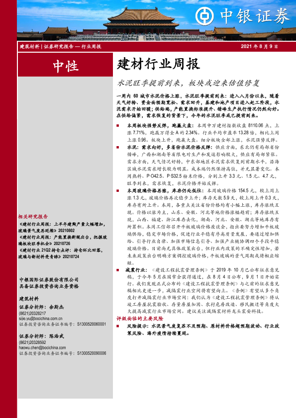 【中银证券】【20210809】建材行业周报:水泥旺季提前到来,板块或迎来估值修复-23页