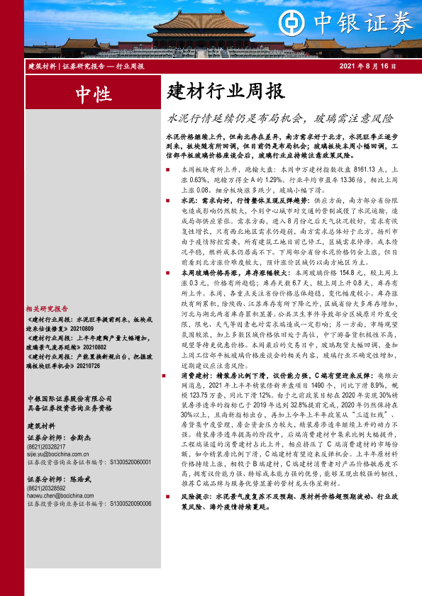 【中银证券】【20210816】建材行业周报:水泥行情延续仍是布局机会,玻璃需注意风险-18页