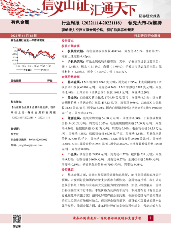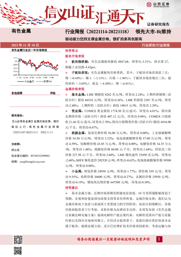 【山西证券】【20221118】有色金属行业周报:驱动接力空挡支撑金属价格,锂矿拍卖再创新高-20页