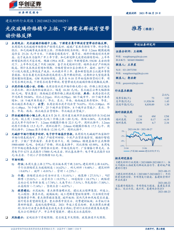【华创证券】【20210829】建筑材料行业周报:光伏玻璃价格稳中上扬,下游需求释放有望带动价格反弹-20页