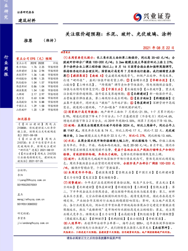 【兴业证券】【20210822】建筑材料行业周报:关注涨价超预期-22页