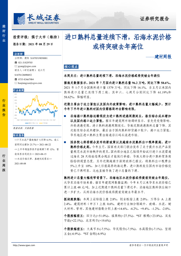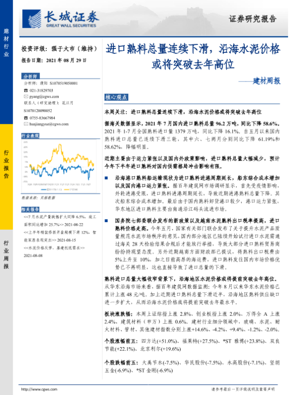 【长城证券】【20210829】进口熟料总量连续下滑,沿海水泥价格或将突破去年高位-21页
