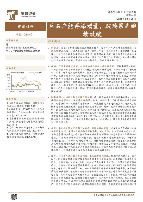 【德邦证券】【20210829】建筑材料行业周报:巨石产能再添增量,玻璃累库继续放缓-19页