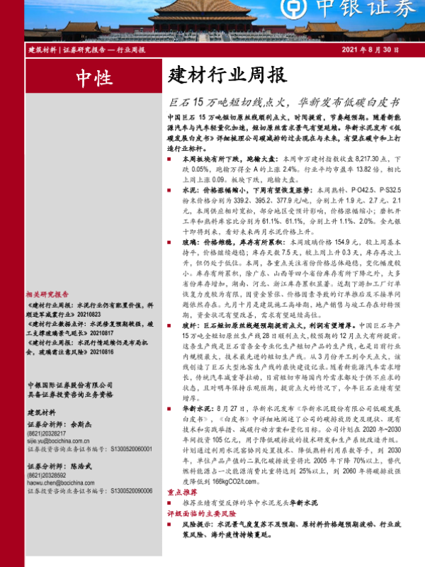 【中银证券】【20210830】建材行业周报:巨石15万吨短切线点火,华新发布低碳白皮书-24页