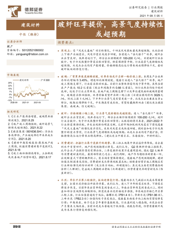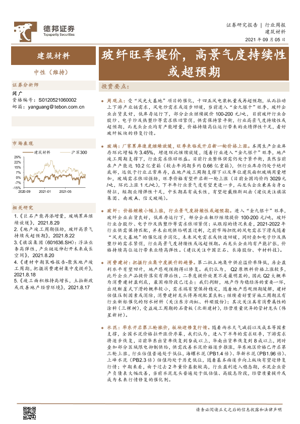 【德邦证券】【20210905】建筑材料行业周报:玻纤旺季提价,高景气度持续性或超预期-19页