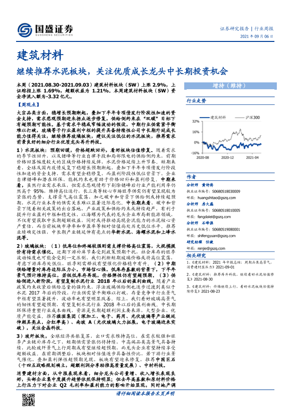 【国盛证券】【20210906】建筑材料行业周报:继续推荐水泥板块,关注优质成长龙头中长期投资机会-13页
