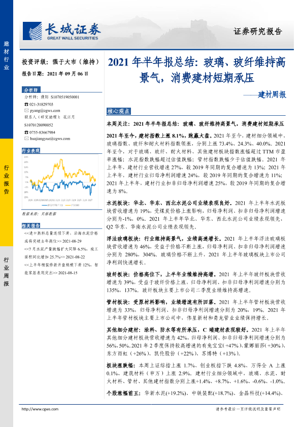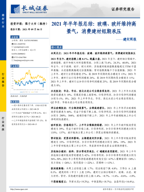 【长城证券】【20210906】2021年半年报总结:玻璃、玻纤维持高景气,消费建材短期承压-25页