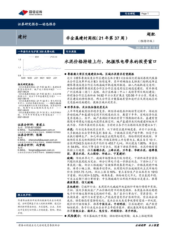 【国信证券】【20210913】非金属建材周报:水泥价格持续上行,把握限电带来的投资窗口-16页