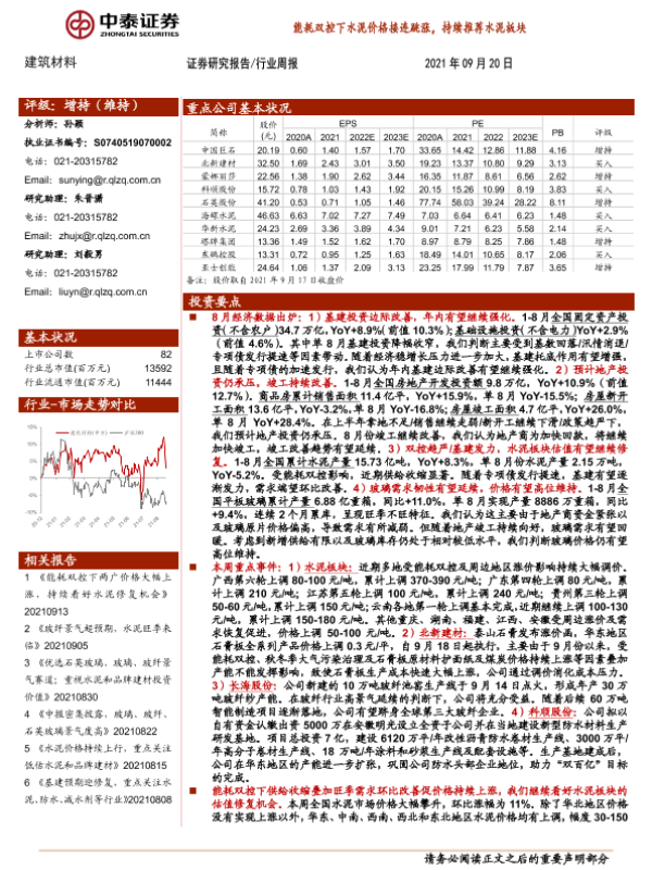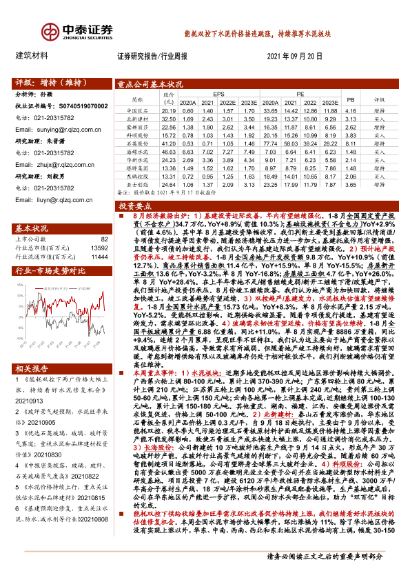 【中泰证券】【20210920】建筑材料行业周报:能耗双控下水泥价格接连跳涨,持续推荐水泥板块-25页