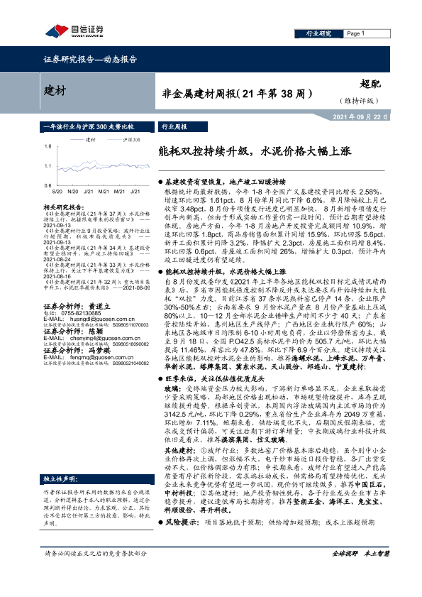 【国信证券】【20210922】非金属建材周报:能耗双控持续升级,水泥价格大幅上涨-15页