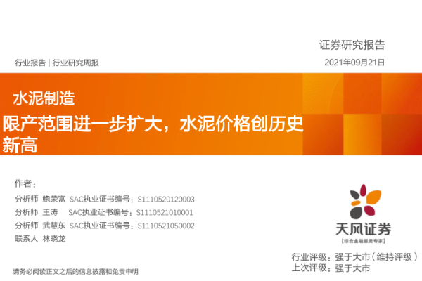【天风证券】【20210921】水泥制造行业研究周报:限产范围进一步扩大,水泥价格创历史新高-23页