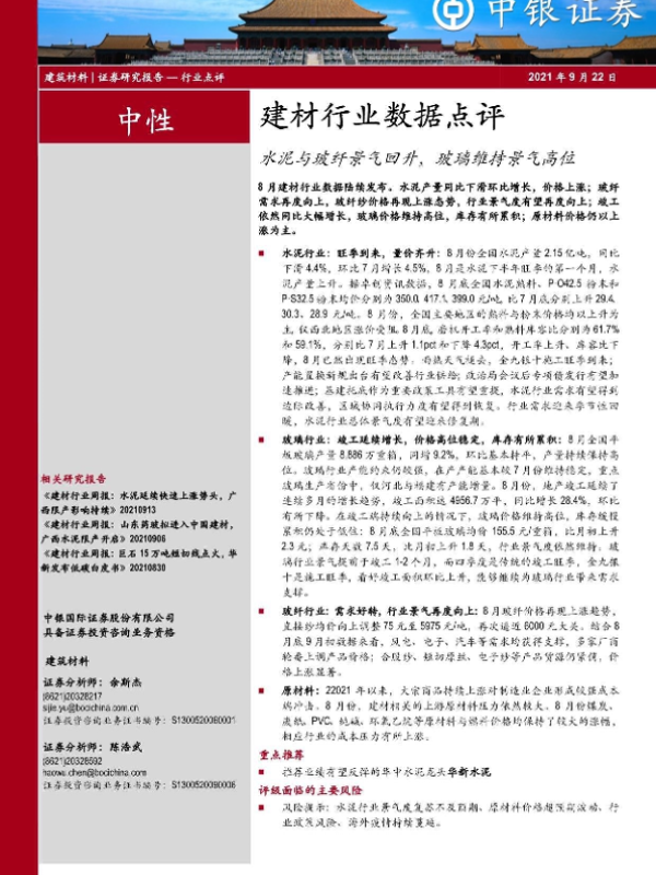 【中银证券】【20210922】建材行业数据点评:水泥与玻纤景气回升,玻璃维持景气高位-9页