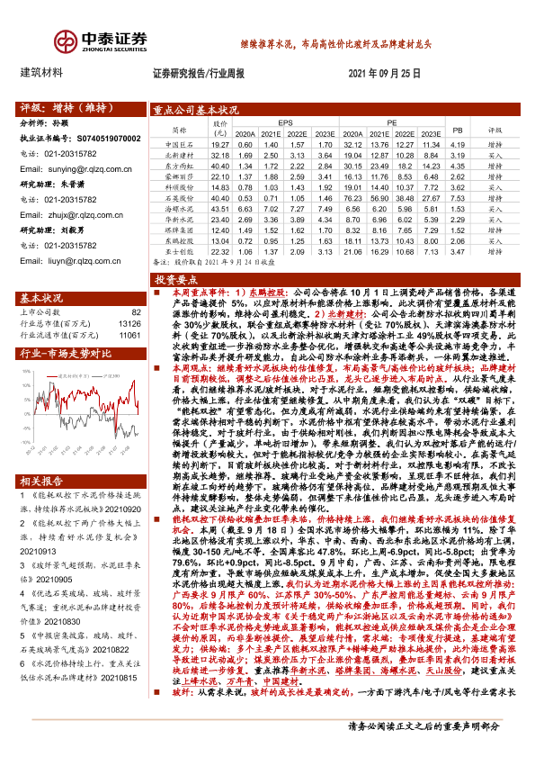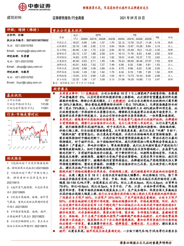 【中泰证券】【20210925】建筑材料行业周报:继续推荐水泥,布局高性价比玻纤及品牌建材龙头-25页