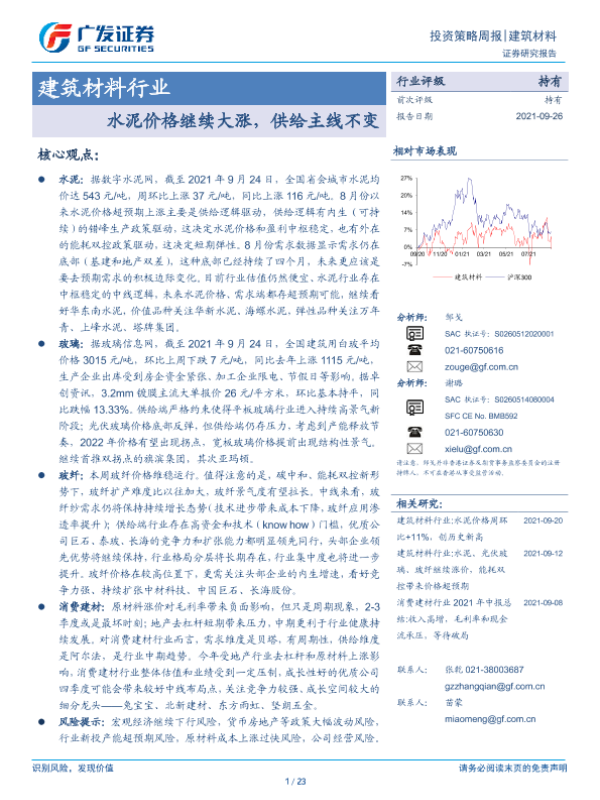 【广发证券】【20210926】建筑材料行业投资策略周报:水泥价格继续大涨,供给主线不变-23页
