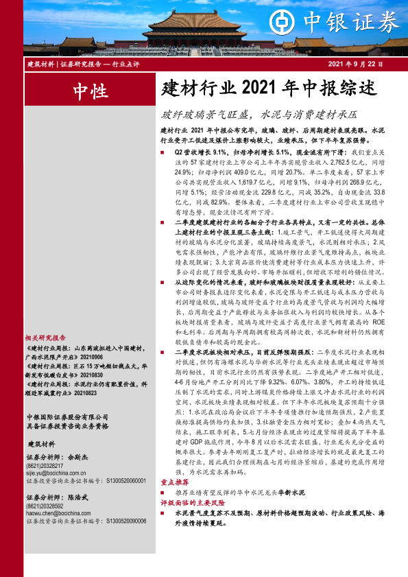 【中银证券】【20210922】建材行业2021年中报综述:玻纤玻璃景气旺盛,水泥与消费建材承压-18页