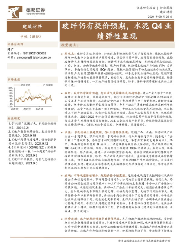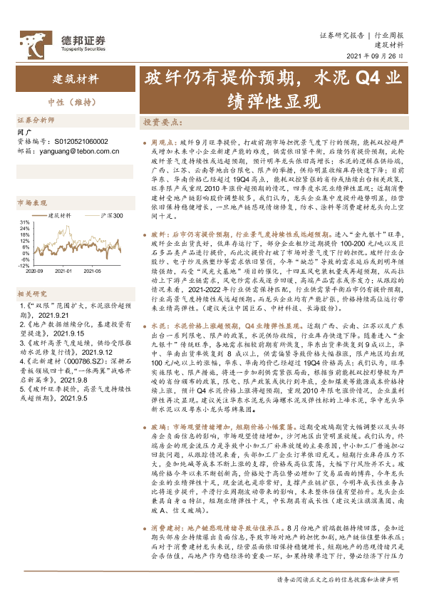 【德邦证券】【20210926】建筑材料行业周报:玻纤仍有提价预期,水泥Q4业绩弹性显现-19页