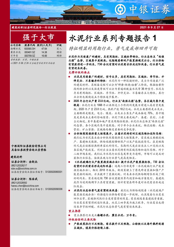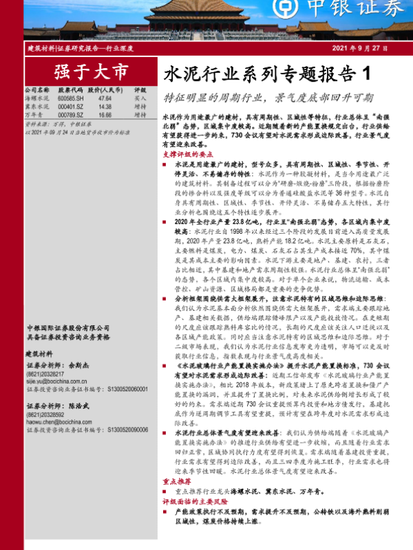 【中银证券】【20210927】水泥行业系列专题报告1:特征明显的周期行业,景气度底部回升可期-52页