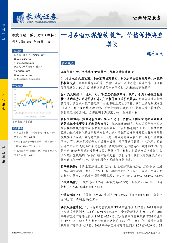 【长城证券】【20211010】十月多省水泥继续限产,价格保持快速增长-21页
