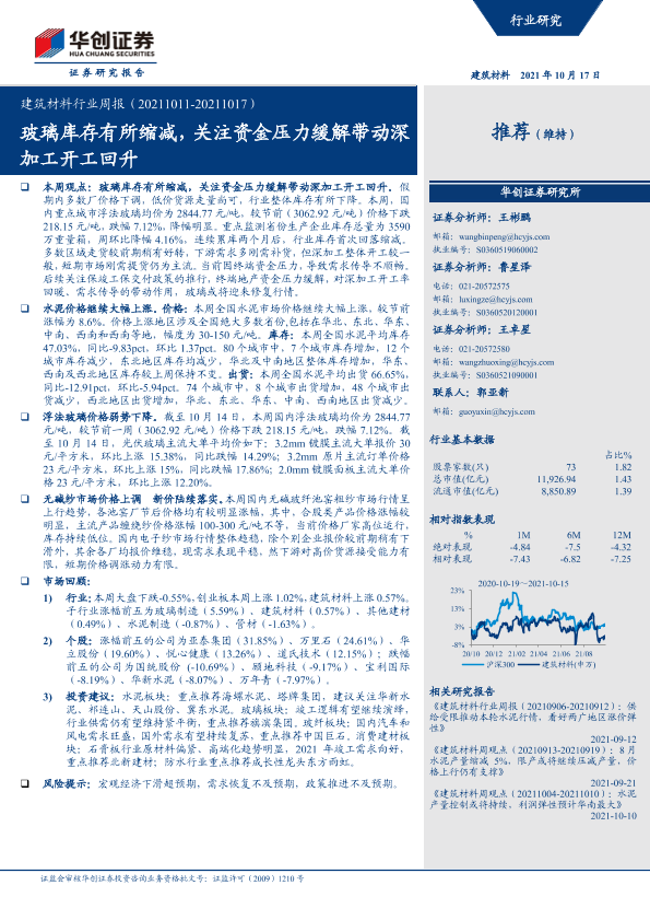 【华创证券】【20211017】建筑材料行业周报:玻璃库存有所缩减,关注资金压力缓解带动深加工开工回升-20页